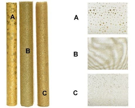 Tischläufer aus Polyester mit Glitzer, GOLD gewebter Glitzer, Organza. 200 x 35 cm. Diese Rille in GOLD ist Modell B auf dem Foto und ist in zwei weiteren Nuancen oder Mustern erhältlich. Geeignet als schöne Tischdekoration für den Weihnachtstisch und andere Feste. Das Material ist 100 % Polyester und flammenbeständig.