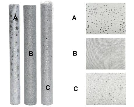 Tischläufer aus Polyester mit Glitzer, SILBER mit Sternen, Organza. 200 x 35 cm. Diese Rolle in SILBER ist Modell A auf dem Foto und ist in zwei weiteren Nuancen oder Mustern erhältlich. Geeignet für schöne Tischdekoration zu Weihnachten, Neujahr oder Silberhochzeitsfeier. Das Material ist 100 % Polyester und flammenbeständig.