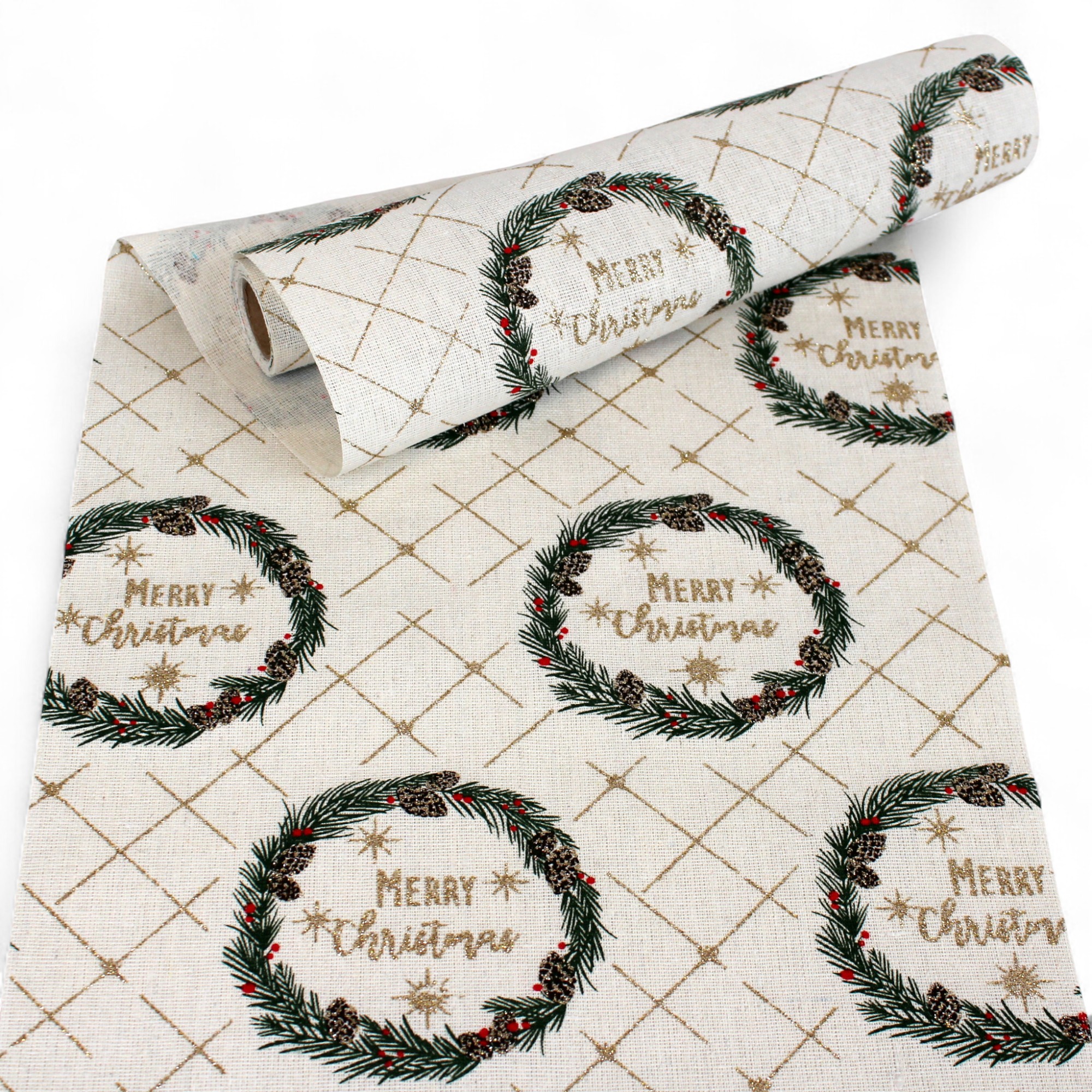 Tischläufer in cremefarben mit schönem Weihnachtsmotiv mit grünen Beerengirlanden mit Zapfen und Goldmuster und dem Text Merry Christmas. Tischläufer cremefarben gewebtes Polyester mit Dekoration. Festliche Tischdekoration für alle Feste und Weihnachten und Neujahr. 2,0 m lang und 28 cm breit. Kann mit einem feuchten Tuch abgewischt und wiederverwendet werden. Das Material ist Polyester und ist flammenbeständig.