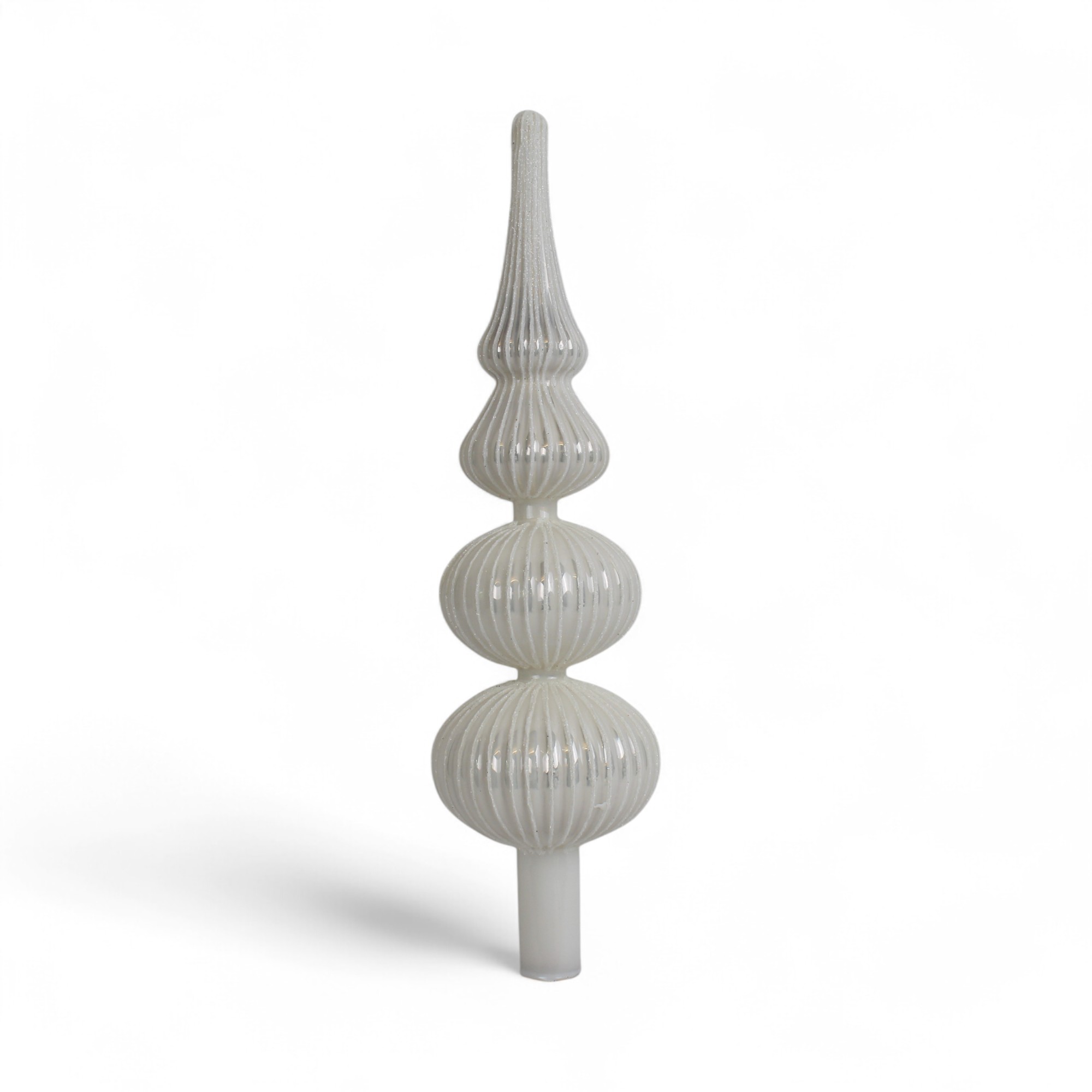 Topper aus Glas, weiß mit Rillen und Glitzer, Durchmesser 7,2 cm. 31 cm.