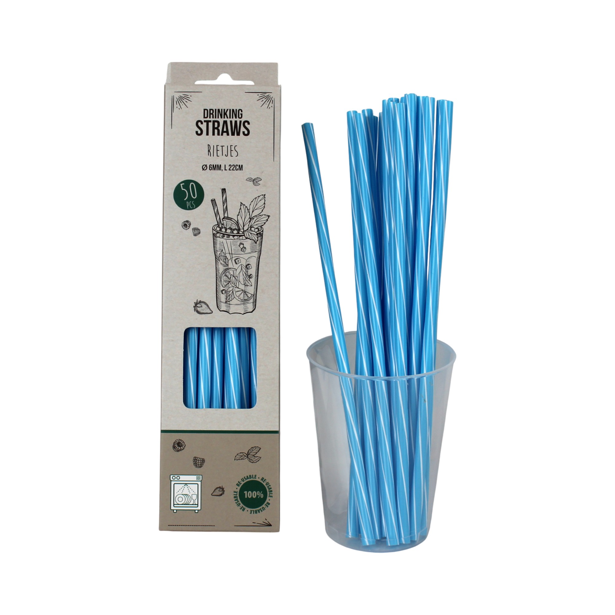 Strohhalme in einfarbig BLAU mit einem diagonalen weißen schmalen Streifen. Die Strohhalme sind aus haltbarem Polypropylen (Plastik) hergestellt, das mehrfach verwendet werden kann und spülmaschinenfest ist. Maximaltemperatur von 40 Grad. Geliefert in einer Schachtel à 50 Stk. Länge 22 cm. Durchmesser von 6 mm. Die kräftigen Strohhalme sind geeignet für Getränke und Limonade und in mehreren Farben erhältlich.