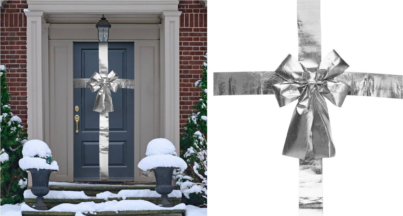 Große Schleife für die Tür. Verpacken Sie Ihre Tür wie ein großes Weihnachtsgeschenk. Schaffen Sie einen auffälligen und festlichen Eingang mit dieser eleganten Türschleife in SILBER. Die Schleife ist aus Polyester gefertigt und misst 33 x 10 x 42 cm. Die mitgelieferte Türbandlösung misst ganze 4,3 Meter und ist mit Klettverschluss ausgestattet, sodass sie einfach zu befestigen und nach Bedarf anzupassen ist. Die schöne Farbe fängt das Licht ein und verleiht jeder Tür einen luxuriösen Touch – sowohl zu Hause als auch in Geschäftsumgebungen. Material: Polyester Größe der Schleife: 33 x 10 x 42 cm Türband: 4,3 Meter lang Mit Klettverschluss für einfache Montage Farbe: Glänzendes Silber