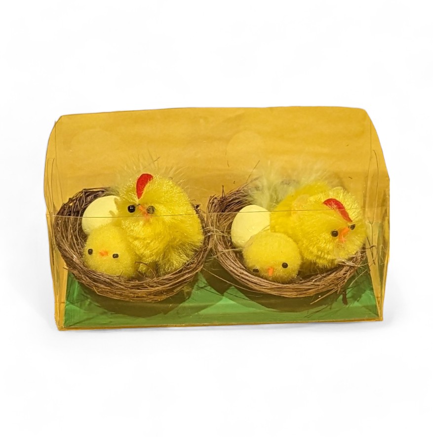 Vogelnester mit Küken, Henne und Ei. 2 Stück. Durchmesser 5,5 cm.
