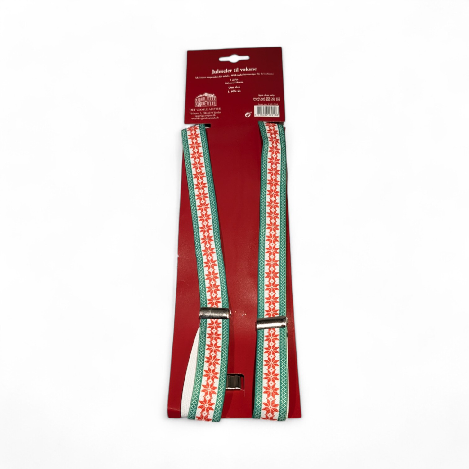 Juleseler für Erwachsene mit Weihnachtssternen in ROT, WEISS und GRÜN. One size. Die Senerne messen 1 m in der Länge und sind 2,5 cm breit. Sie können mit der Klemme angepasst werden. Befestigt mit Schnallen aus Metall und hinten mit imitiertem Leder zusammengefügt. Material ist Polyester und Elastin. Werden Sie festlich gekleidet oder kaufen Sie es als Kalendergeschenk.