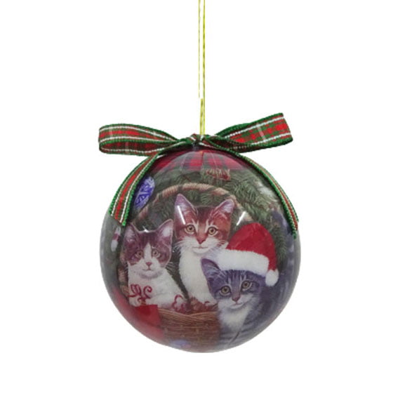 Weihnachtskugel mit drei Kätzchen mit und ohne Hut.