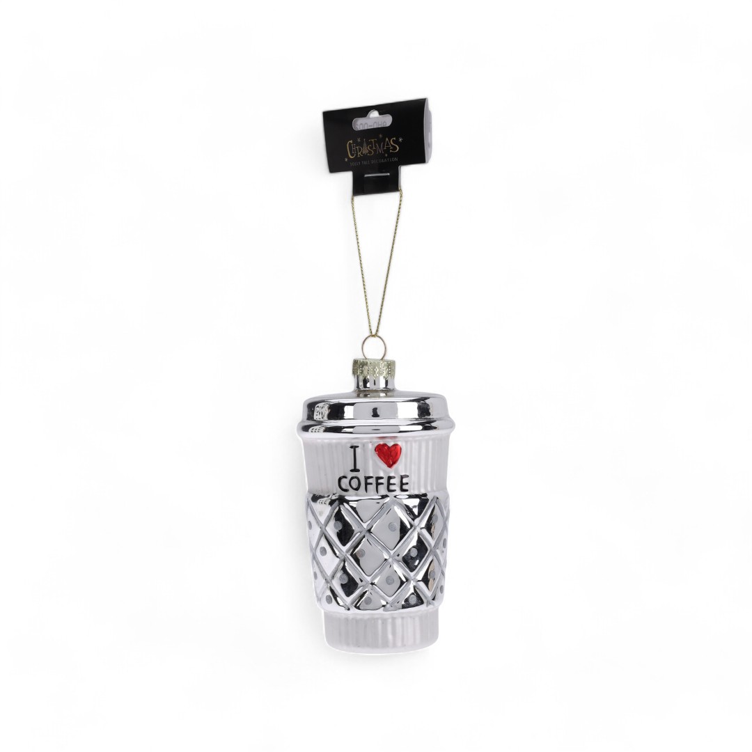 Weihnachtskugelfigur aus Glas als Kaffeetasse in Silber zum Aufhängen am Weihnachtsbaum.