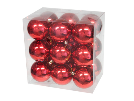 Die Box enthält insgesamt 18 Stück rote glänzende Plastik Weihnachtskugeln. Durchmesser 7,7 cm.