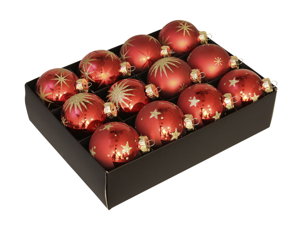 Weihnachtskugeln Glas ROT Ø75 Dekoration mit STERN Muster 12 Stk.