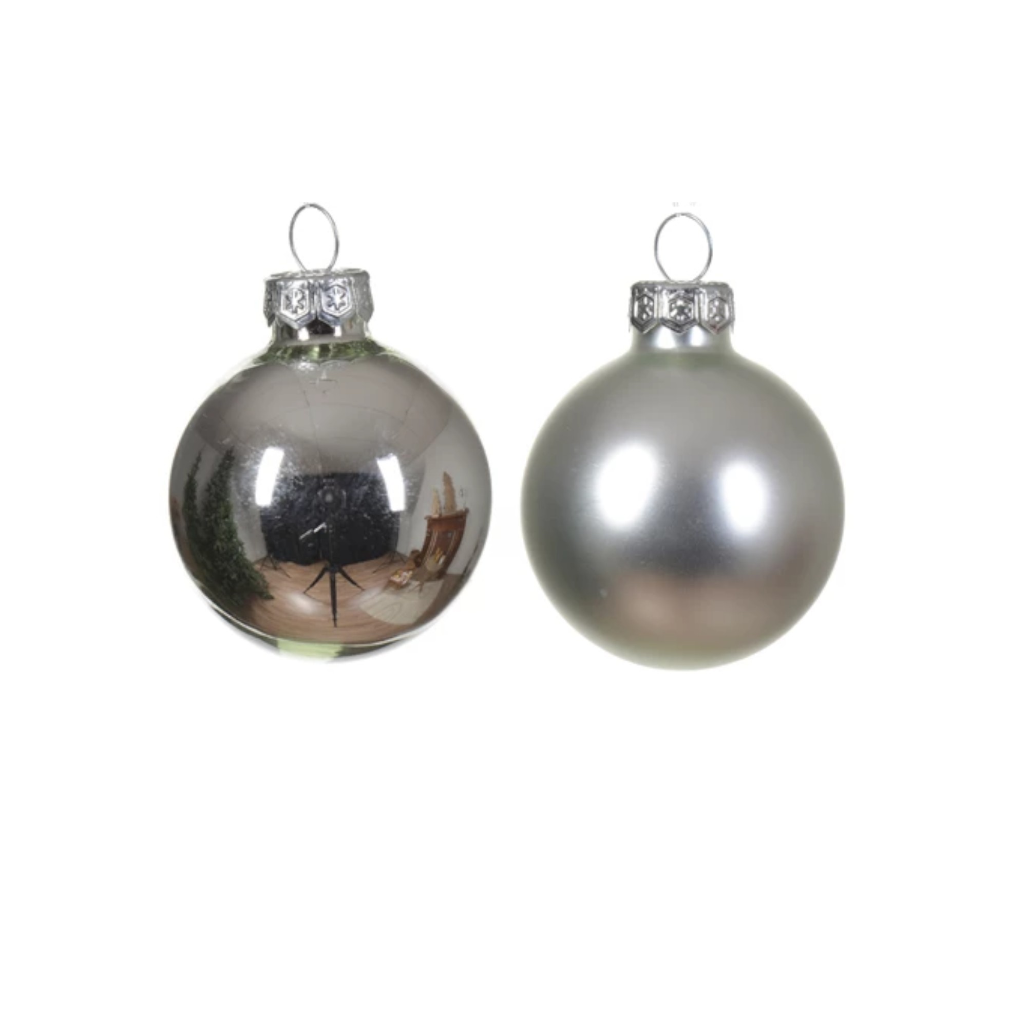 glas julekugler med diameter 4 centimeter i blank og mat sølv farve