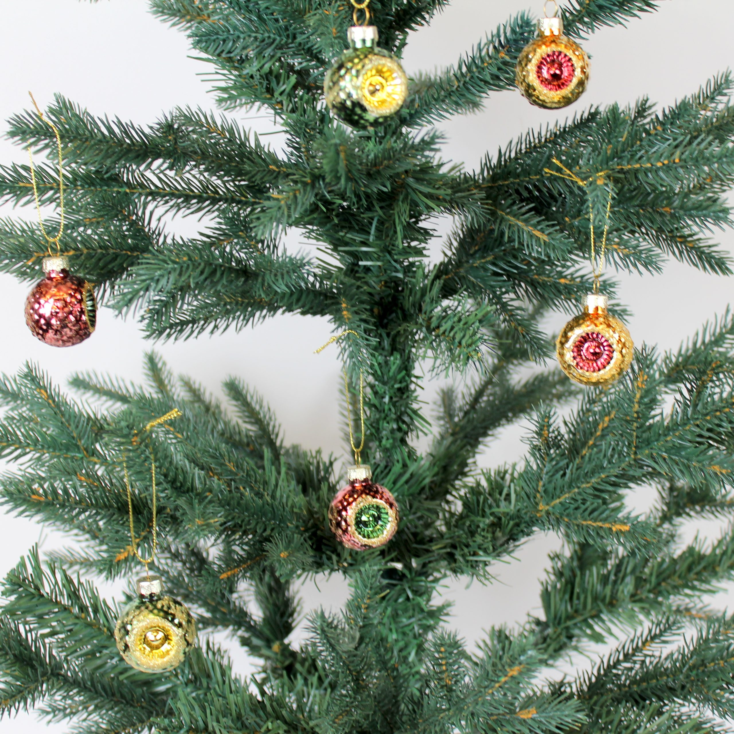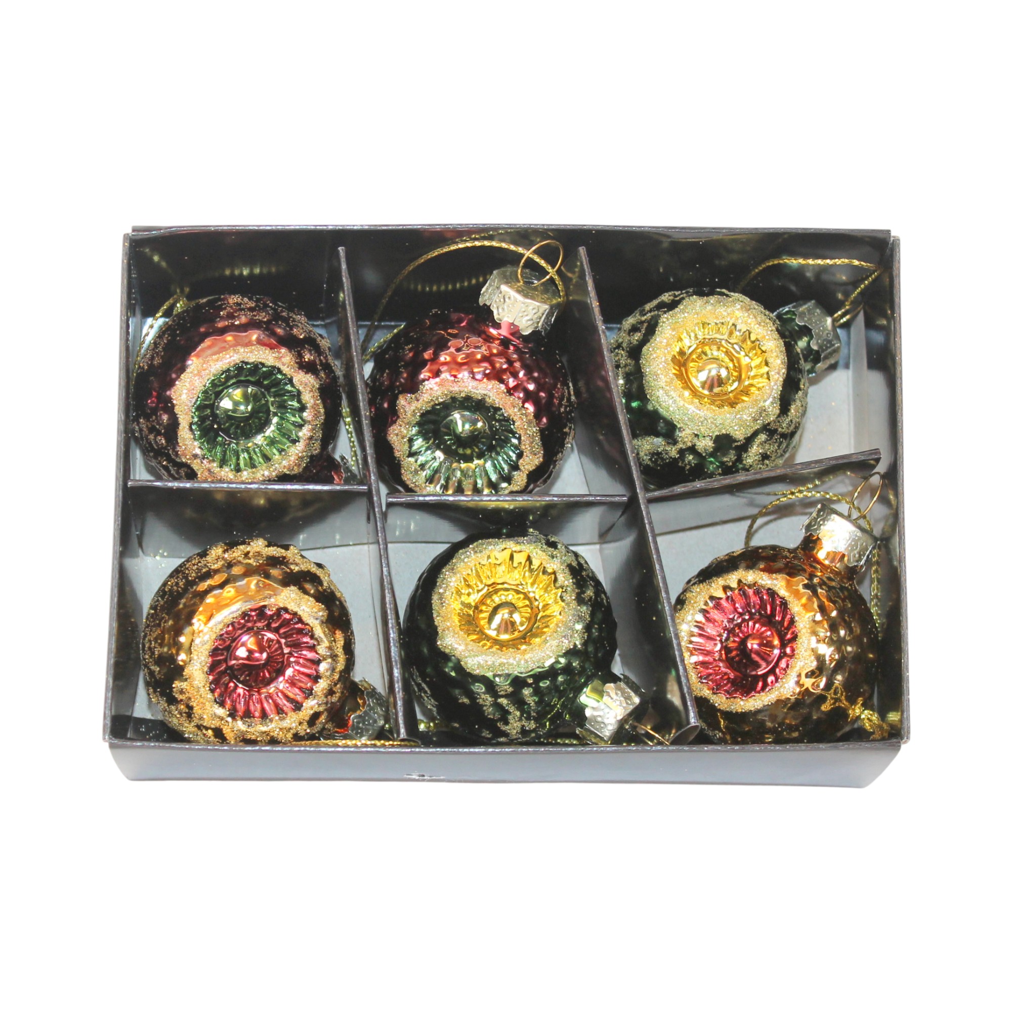 6 styk 4 centimeter store refleks julekugler i glas i guld, grøn og pink