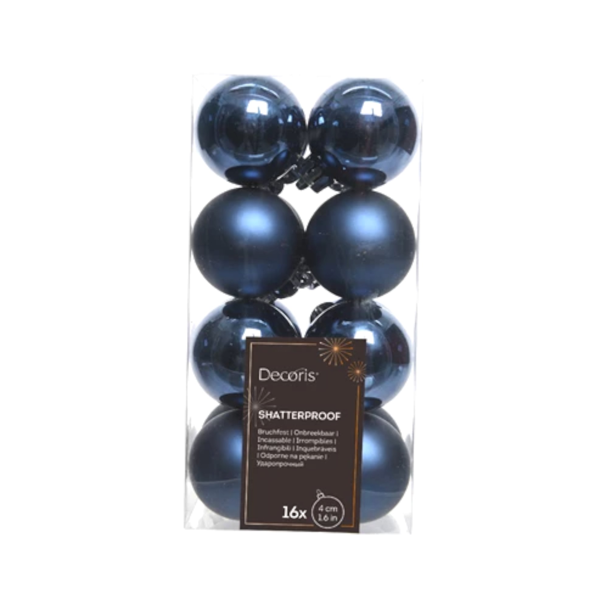 plastik julekugler med diameter fire centimeter i farven midnats blå sejsten styk i pakken