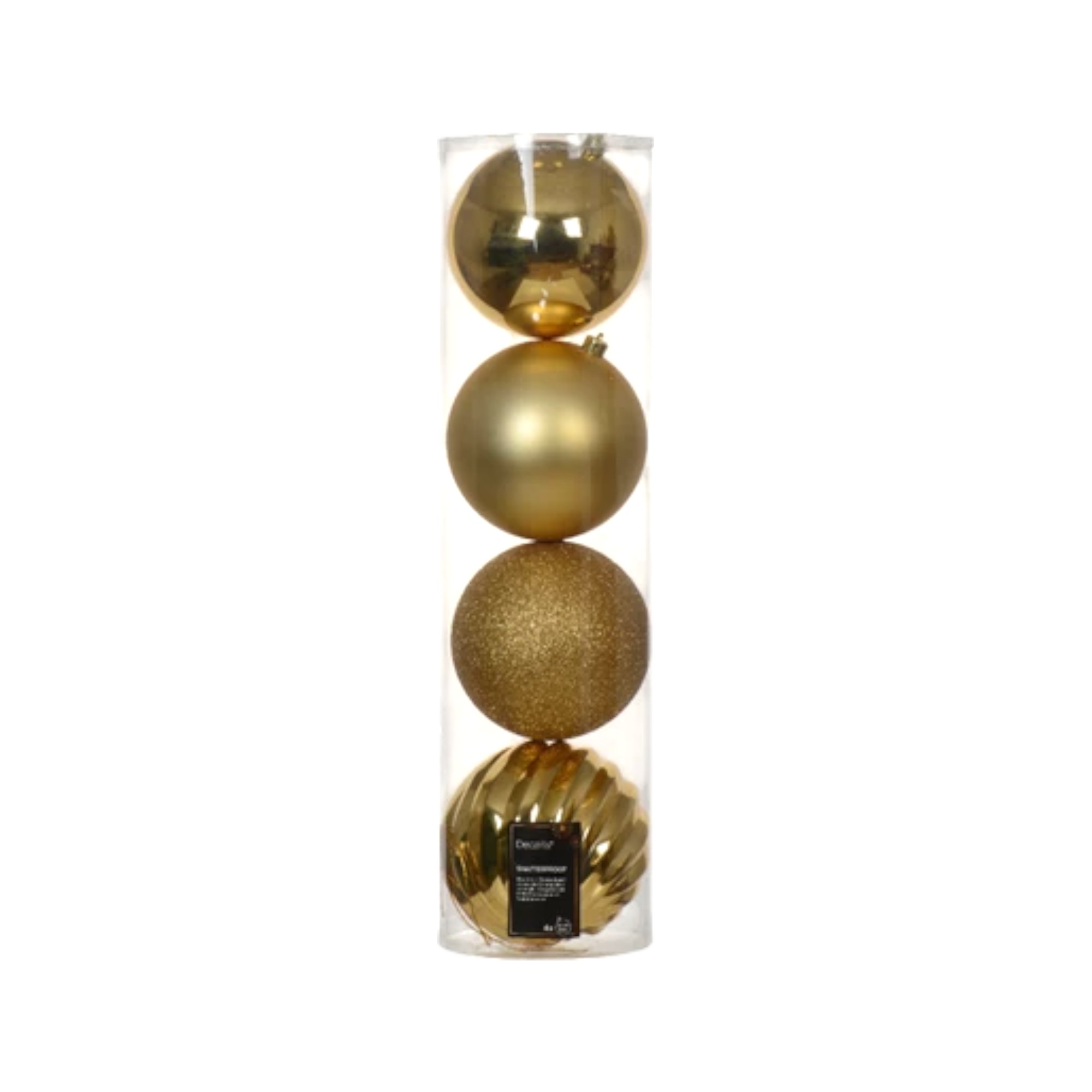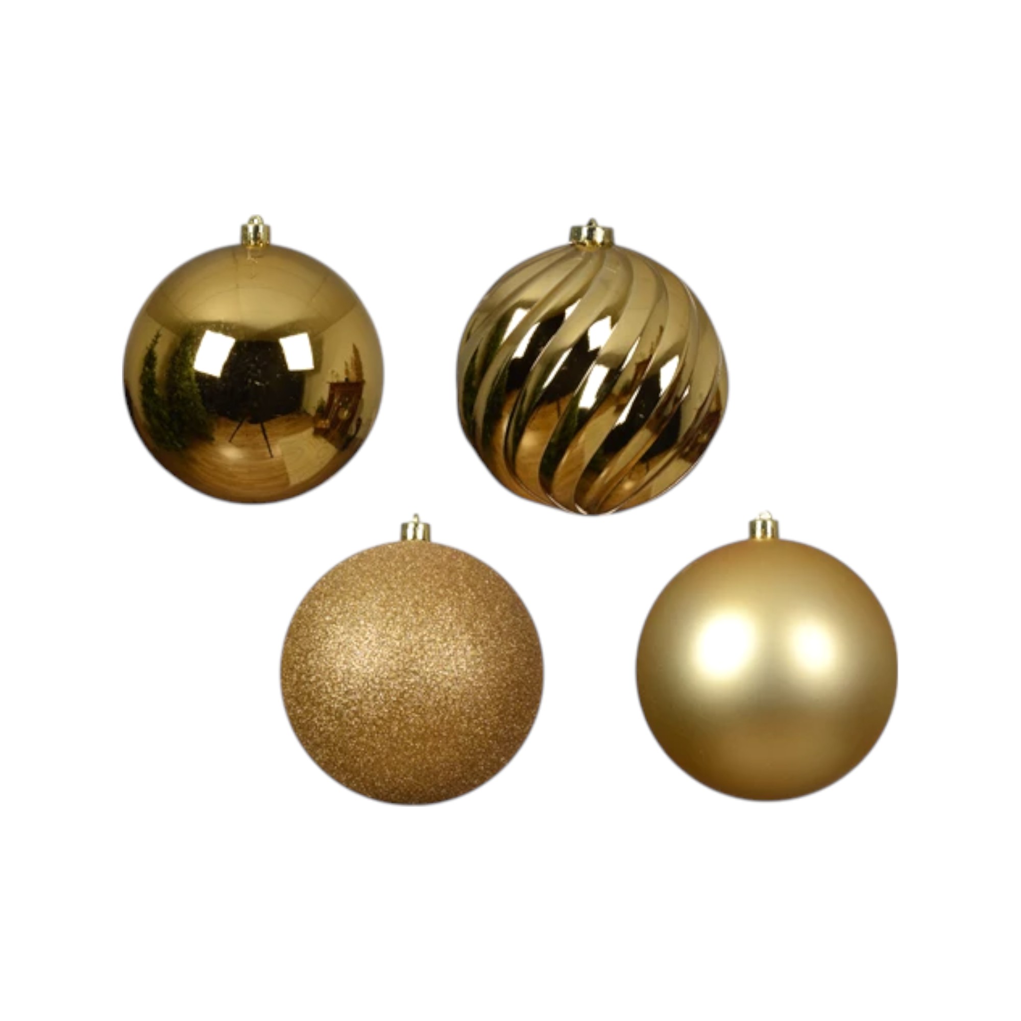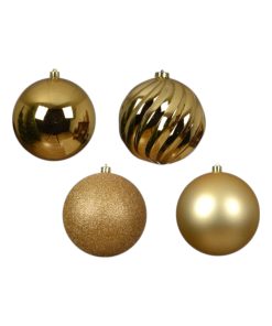 Plastik Weihnachtskugeln, GOLD, groß mit einem Durchmesser von 14 cm. Paket mit 4 verschiedenen Weihnachtskugeln (1 Stk. glänzend, 1 Stk. matt, 1 Stk. mit Rillen, 1 Stk. Glitzer). Große Weihnachtskugeln sind schöne Weihnachtsdekoration, wenn sie in deinem Wohnzimmer oder Fenster hängen. Füge eventuell einen Tannenzweig hinzu und spüre die Weihnachtsstimmung. Große Weihnachtskugeln sind auch wirklich schöne und geeignete Weihnachtsdekoration in großen Räumen wie Restaurants, Cafés, Geschäften oder in Büros.
