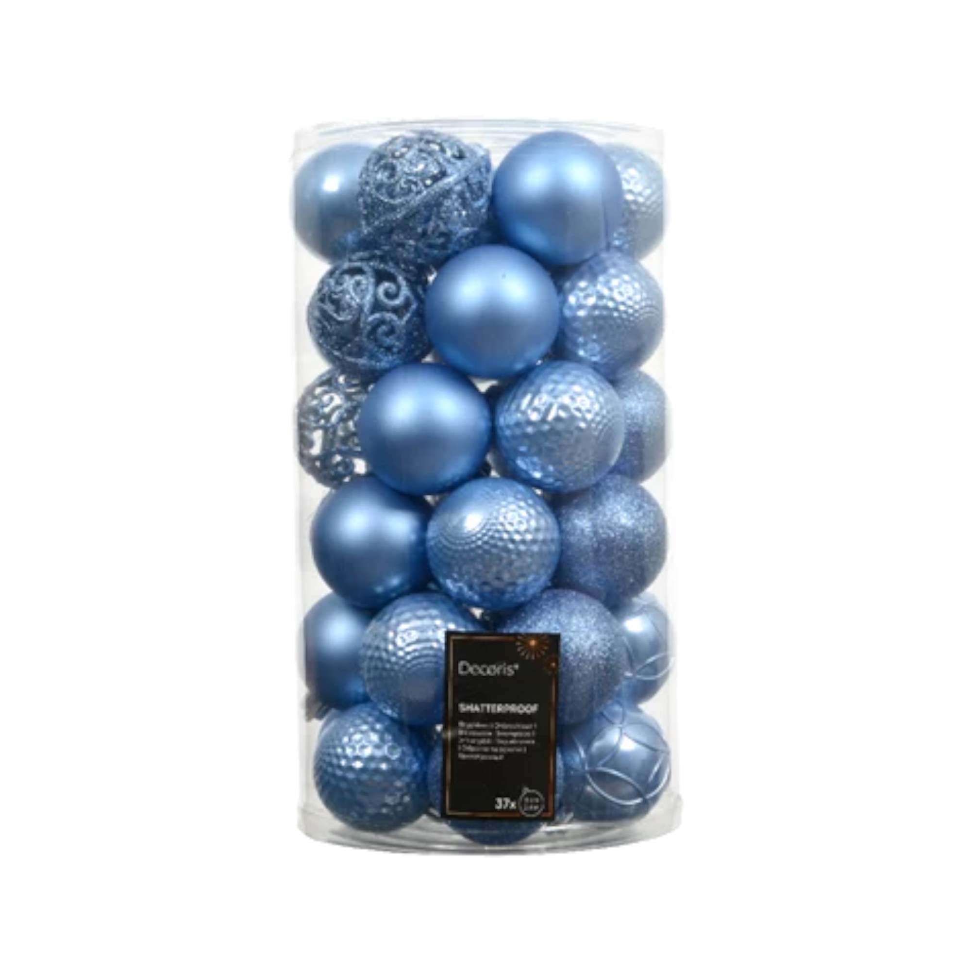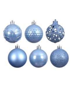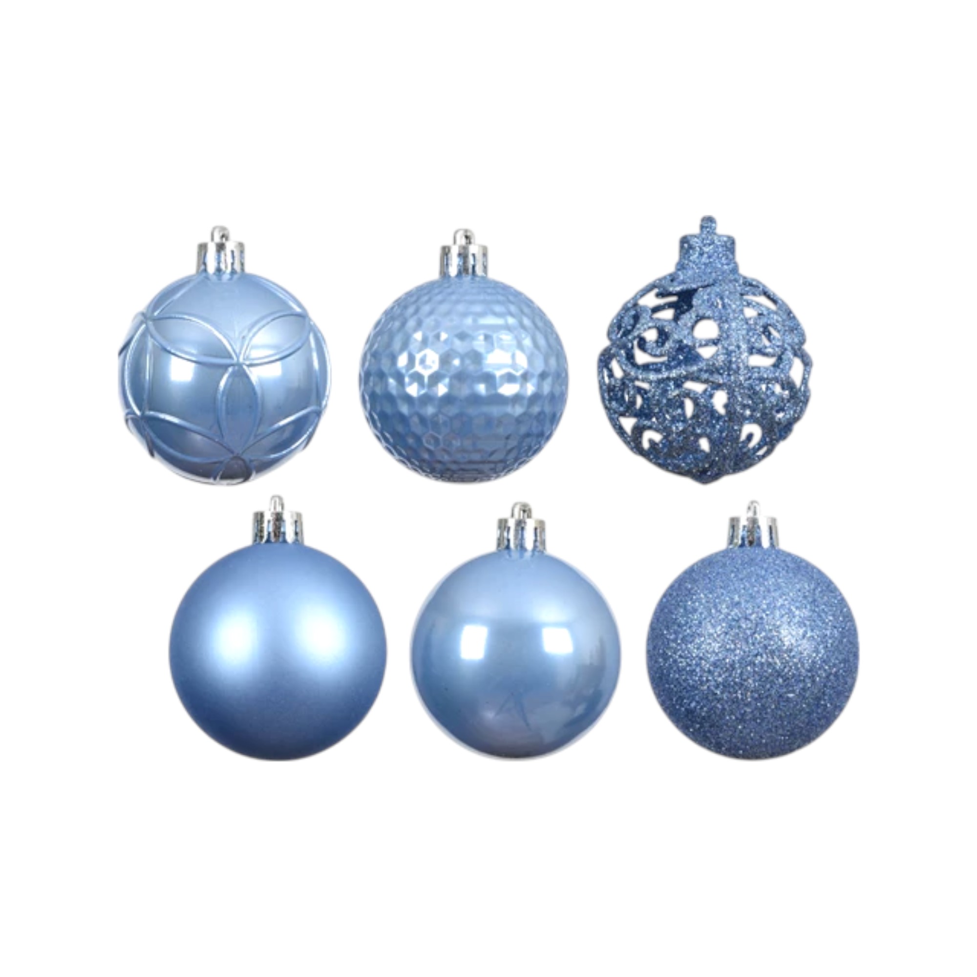 plastik julekugler med diameter seks centimeter i farven himmelblå også kaldet lyseblå og med flere forskellige overflader syvogtredive styk i pakken
