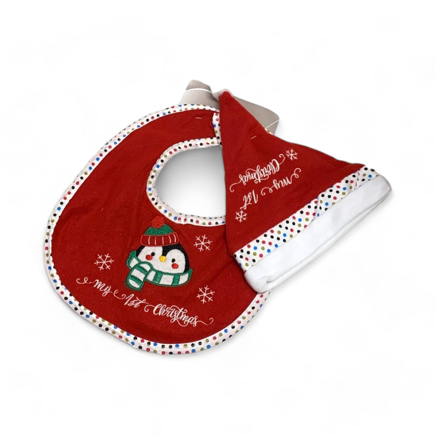 Weihnachtsmütze und Lätzchen. „Mein 1. Weihnachten“ mit Pinguin. Geschenkidee für Baby