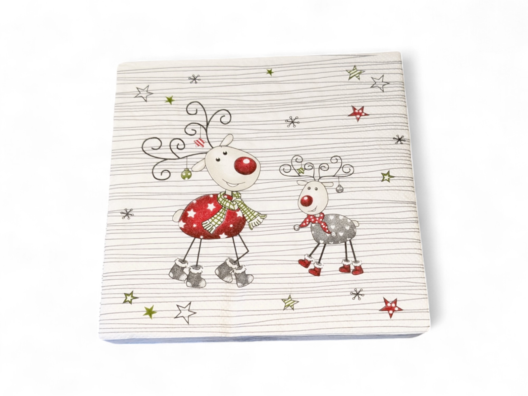 Gestreifte Servietten mit dem Rentier Rudolf mit einem Kalb und Sternen. Die Weihnachtsservietten sind in Frühstücksgröße, 33 x 33 cm. Es gibt 20 Stück pro Packung. Die Servietten haben Druck auf allen 4 Quadraten und sind in der Qualitätsmarke ASP-Holmblad. Das Weihnachtsmotiv auf den Servietten ist mit wasserbasierten Druckfarben gemacht und aus kompostierbarem Material. Chlorfreie Bleiche. Du kannst viele verschiedene Arten von Weihnachtsservietten hier kaufen.