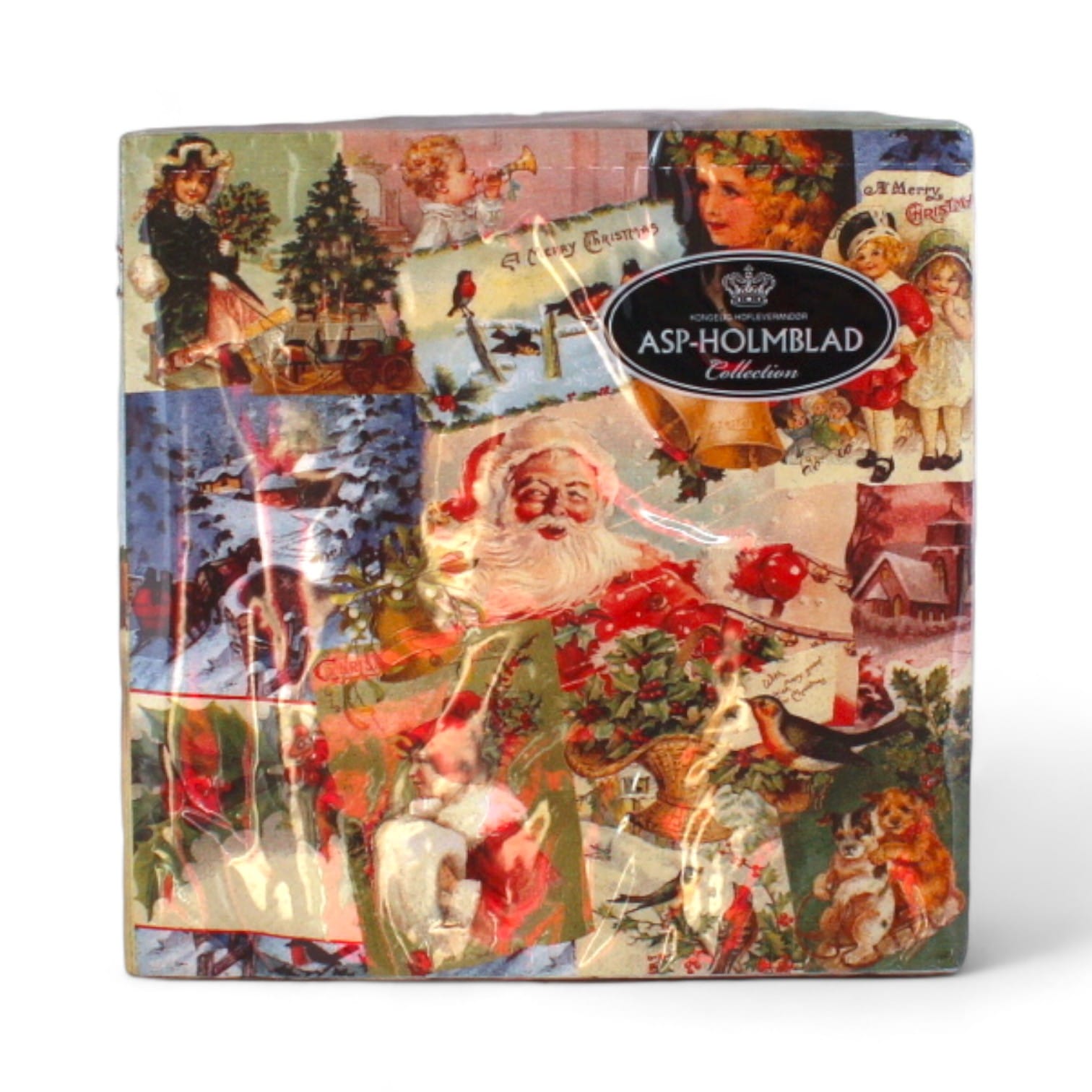 Servietten mehrfarbig mit einer Collage von Weihnachten. Die Servietten sind 3-lagig in der Größe 33 x 33 cm. Es sind 20 Stück in der Packung.