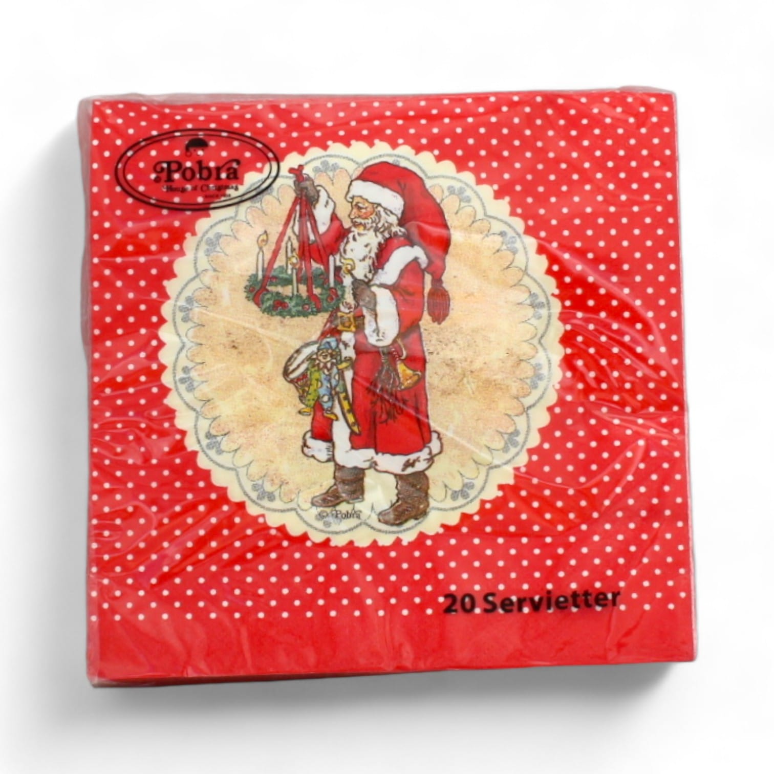 Die Weihnachtsservietten haben die Größe von Mittagessenservietten. Das heißt, entfaltet messen sie 33 x 33 cm. Die Qualität ist 3-lagig und es gibt 20 Stück pro Packung. Schöne rote Servietten für den Weihnachtstisch mit einem nostalgischen Weihnachtsmann im richtigen Weihnachtsmannkostüm. Der alte Weihnachtsmann trägt einen Adventskranz in der Hand und hat eine Trommel und eine Trompete an seinem schwarzen Gürtel hängen. Die Weihnachtsservietten sind dänisches Design. Sie können viele verschiedene Arten von Weihnachtsservietten hier auf alttiljul.dk kaufen. Das Weihnachtsmotiv auf den Servietten ist mit wasserbasierten Druckfarben hergestellt und besteht aus kompostierbarem Material. Chlorfreie Bleichung.