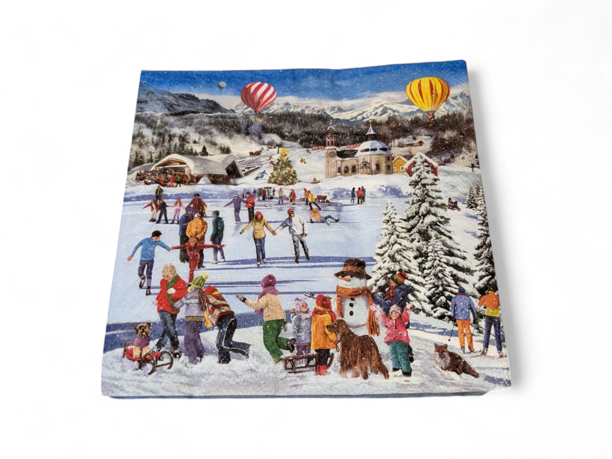 Weihnachtsservietten, MITTAGESSEN, schneebedeckte Landschaft und Menschen. 20 Stk.