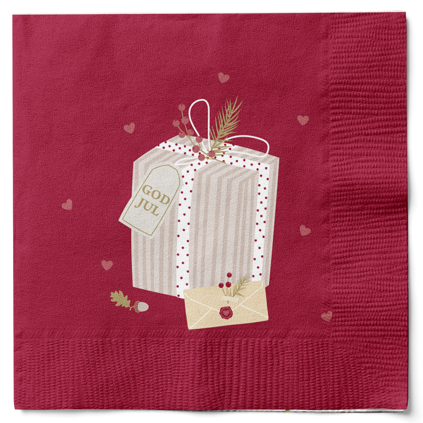 Weihnachtsservietten, ROT mit Weihnachtsgeschenk und Herzen (20 stk.)