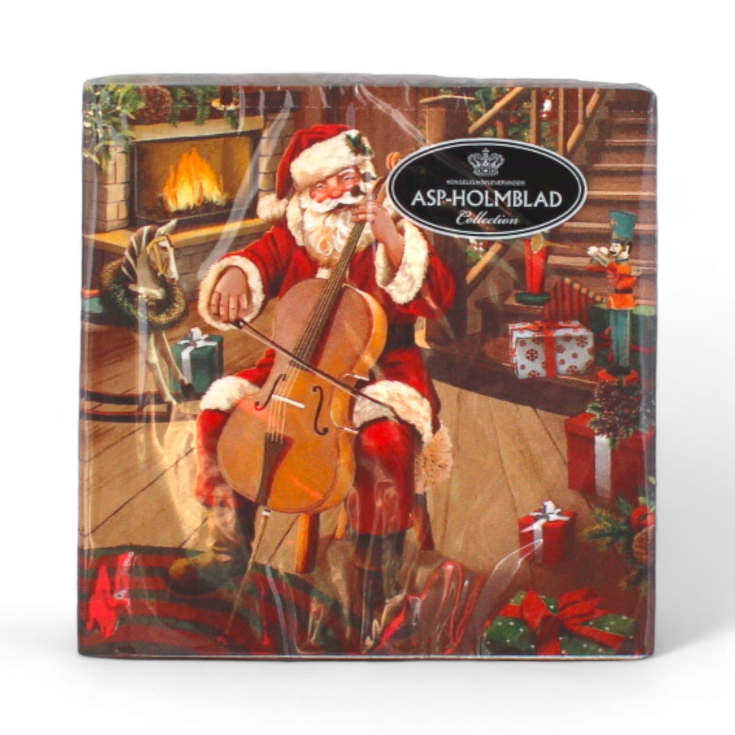 Servietten mit einem Kontrabass spielenden Weihnachtsmann in dunkelgrüner Farbe und anderen gemütlichen Weihnachtsfarben. Die Servietten sind 3-lagig in der Größe 33 x 33 cm. Es sind 20 Stück in der Packung.