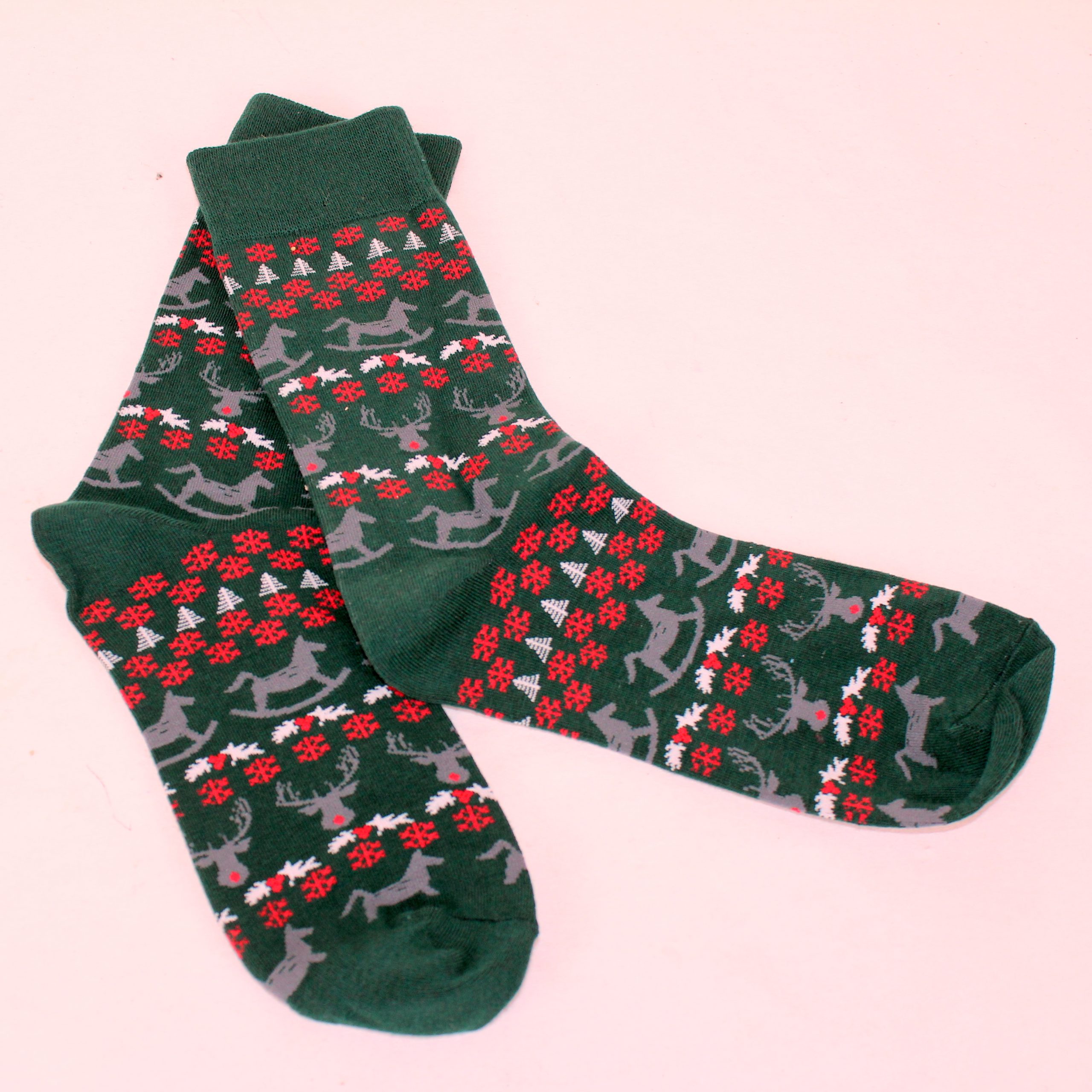 Weihnachtssocken in einem schönen Weihnachtsmuster mit Rentieren und Schaukelpferd in dunkelgrünen Farben. Die Weihnachtssocken passen zu Schuhgröße 36 – 40. Materialien: 75% Baumwolle, 22% Polyester und 3% Spandex. Waschbar bei 30 Grad. Qualitätssocken mit lustigen und schönen Weihnachtsmotiven. Wir haben viele Modelle und Größen. Weihnachtssocken sind ein perfektes Kalendergeschenk oder Adventsgeschenk.