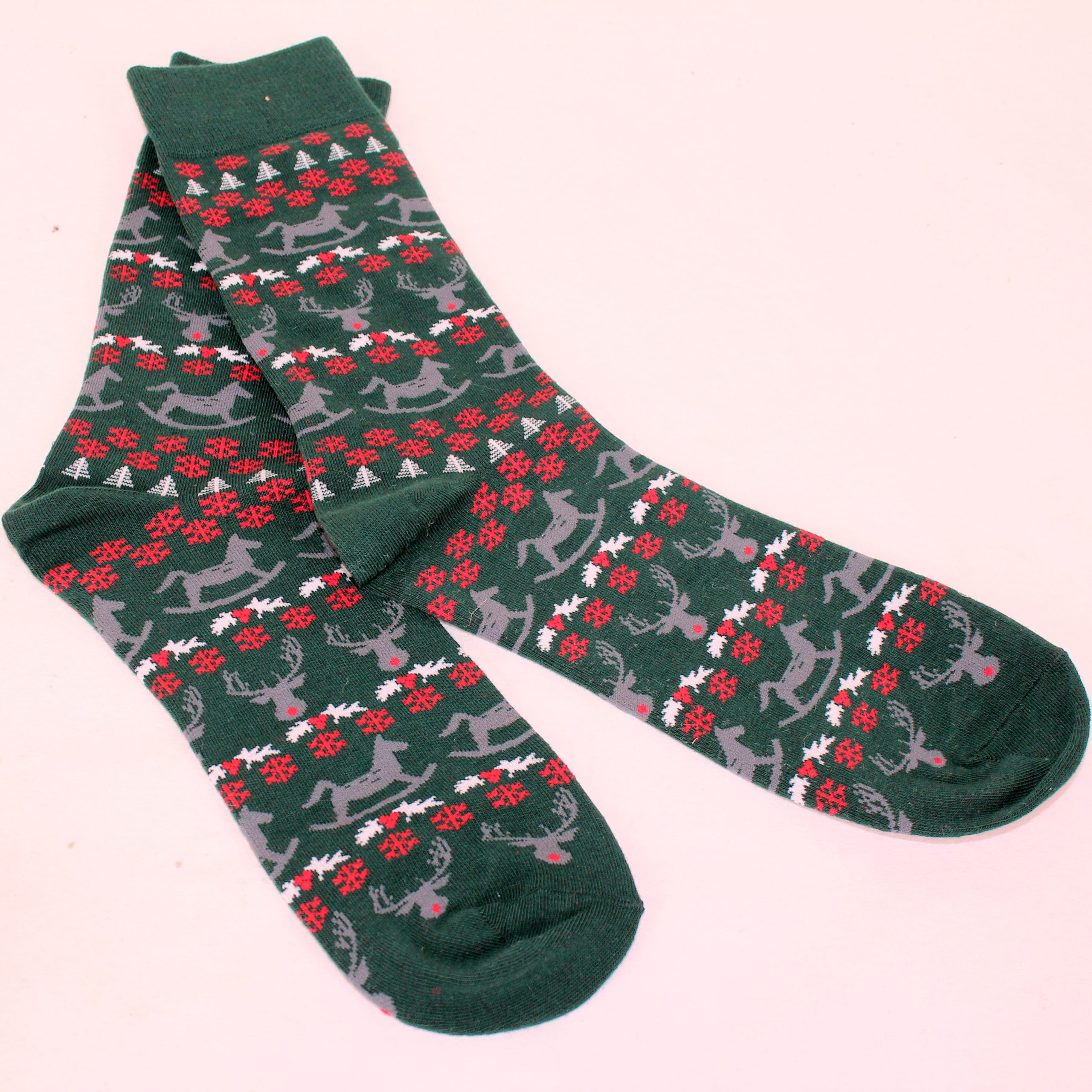 Weihnachtssocken in einem schönen Weihnachtsmuster mit Rentieren und Schaukelpferd in dunkelgrünen Farben. Die Weihnachtssocken passen zu Schuhgröße 40/41 – 47. Materialien: 75% Baumwolle, 22% Polyester und 3% Spandex. Waschbar bei 30 Grad. Qualitätsstrümpfe mit lustigen und schönen Weihnachtsmotiven. Wir haben viele Modelle und Größen. Weihnachtssocken sind ein perfektes Kalendergeschenk oder Adventsgeschenk.