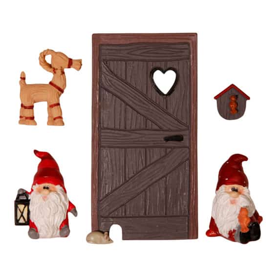 Wichteltür, braun mit zwei Wichteln, Weihnachtsbock, Vogelhaus und Maus, insgesamt 5 Teile. Polystone