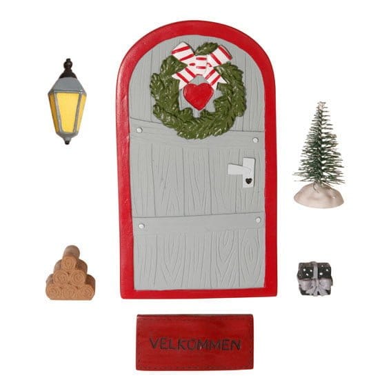 Zubehör für Wichteltür, Wichteltür-Set. 6 Teile. Die Tür ist grau mit einem roten Rahmen und Türkranz. Außerdem sind Lampe, Holzstapel, Baum, Fußmatte und Geschenk enthalten. Gut für Wichtellandschaften.