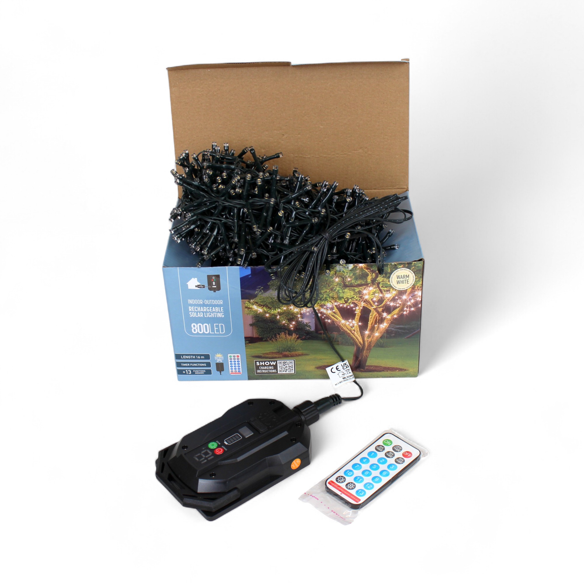 Lichterkette mit 13 Funktionen und Timer für den Außen- und Innenbereich. Aufladung auf zwei Arten. Durch Tageslicht (nicht nur Sonnenlicht) und über USB-Kabel. Die Lichterkette hat 800 LED-Diodenlichter, die in einem warmen weiß leuchten und eine Timerfunktion mit 13 verschiedenen Lichteffekten mit Speicherchip haben, der die letzte gewählte Einstellung speichert. Mit Fernbedienung (inkl. Batterie). Mit abnehmbarem Solarpanel für Innenaufladung mit USB-Kabel. Es gibt 2 cm zwischen jedem Diodenlicht. 3 m Kabel bis zum ersten Licht. 16 m Lichterkette. Passt perfekt zum Aufhängen in Bäumen. Das Kabel ist grün. Kann maximal 40 Stunden pro Aufladung leuchten. Eine Solar-Lichterkette wird oft verwendet, um eine warme und festliche Atmosphäre um Bäume und Büsche im Garten zu schaffen oder zur Dekoration am Haus, und kann auch sowohl drinnen (und draußen) wegen des USB-Kabels verwendet werden.